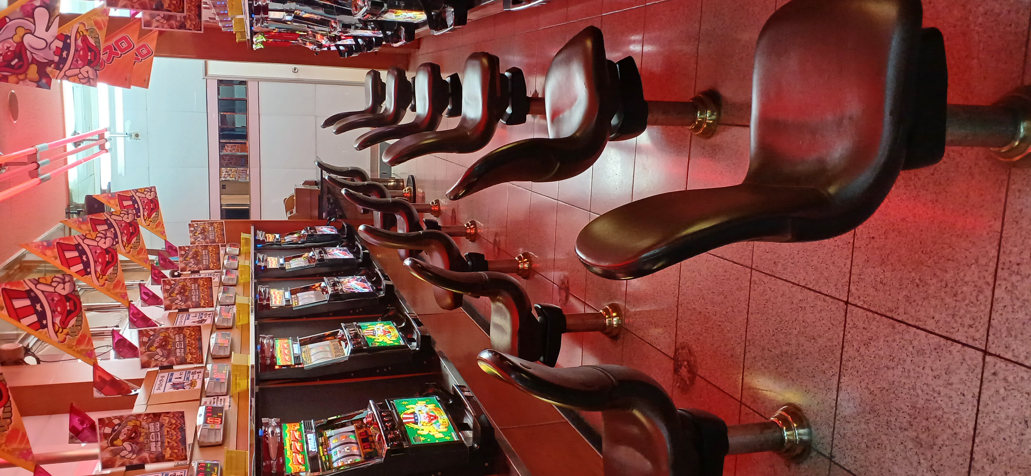 台間シャッターおよび肘掛け未確認、Wi-Fi未確認、USB無し、休憩所や食堂は多分ほぼ無いに等しいが未確認扱いとする、装飾の華やかさは華やかとは言いづらいがレトロな感じに現代の台が混ざってるという意味では好きな人は好きな雰囲気だろう。