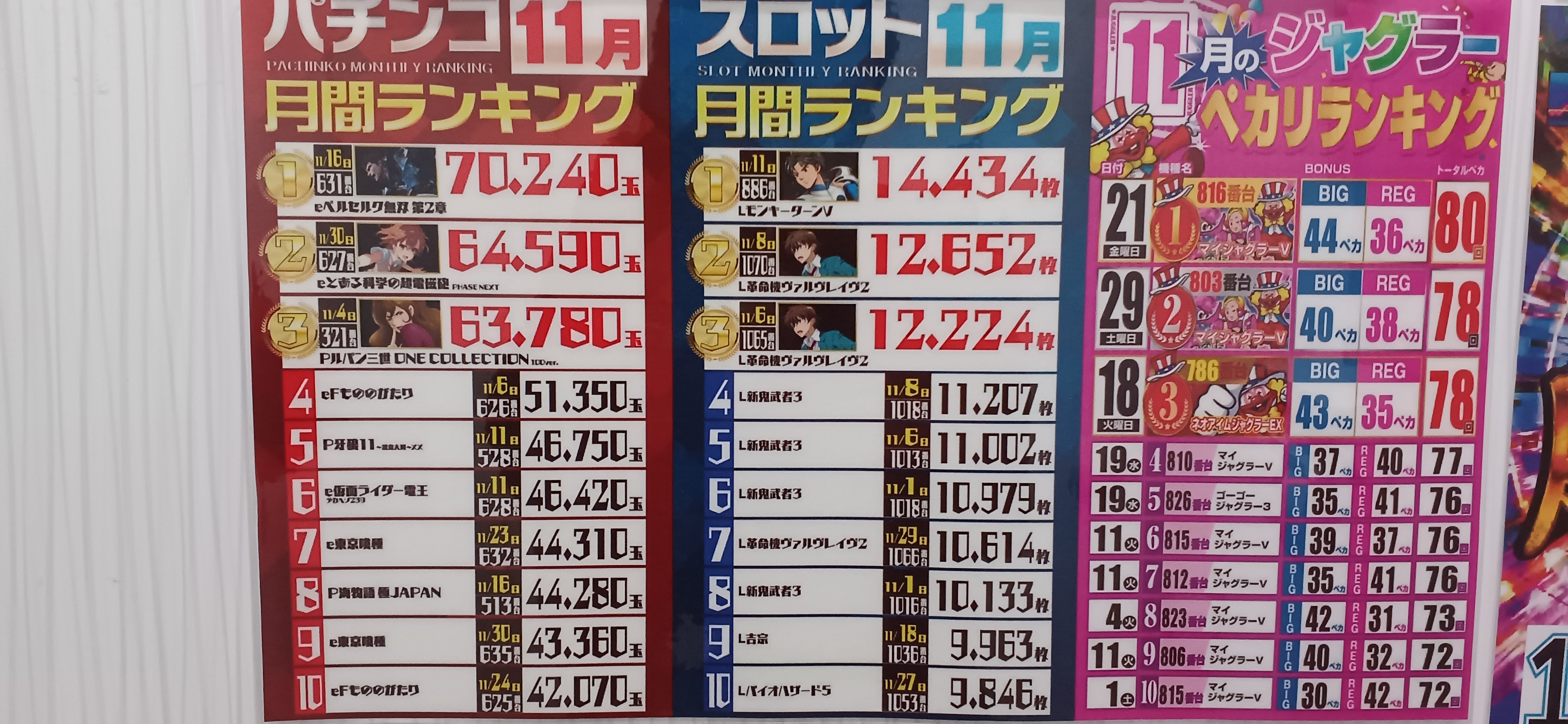 出玉記録は4パチから新台eシン・ウルトラマンが約88120発、角台Pにゃんこ大戦争が保留連からの2万発over、20スロは新台マギレコが3000枚over、スマスロバイオハザード5が5500枚overなど、全体的にかなり出ていた様子。