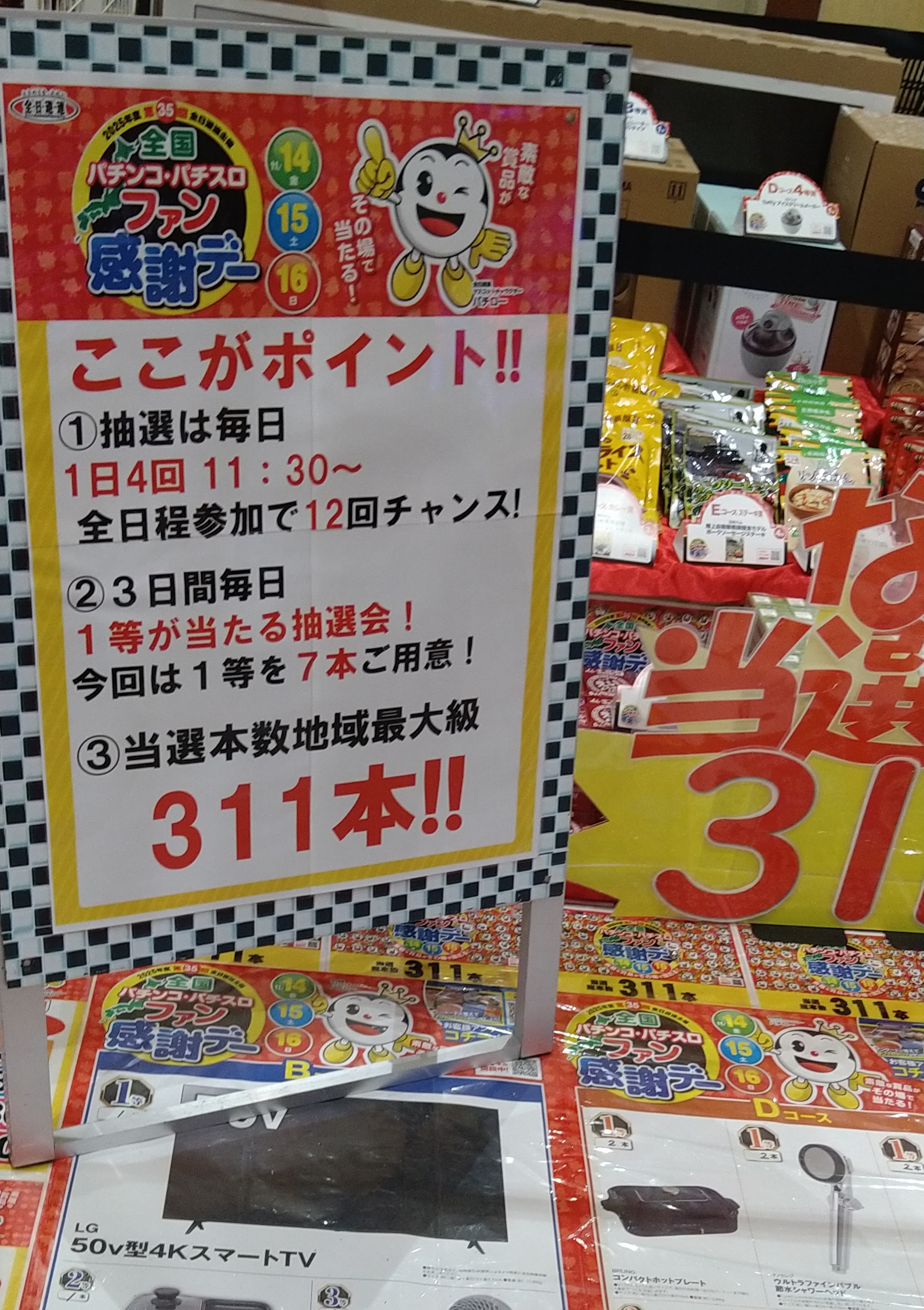 「パチスロの日」という名目でのイベントでしたが、実際には「イベントを開催しないと客足が遠のき、閑古鳥が鳴く」という店舗側の事情を感じさせる内容でした。