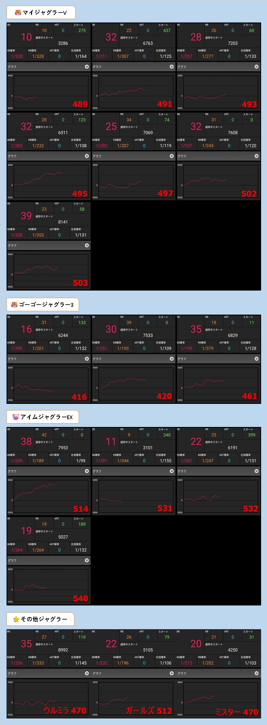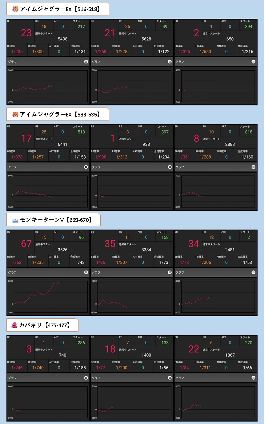 ジャグラーの方の順位は54位と少し下げました。41/76台がプラスでしたが、3000枚オーバーは5台とあまり伸びませんでした。