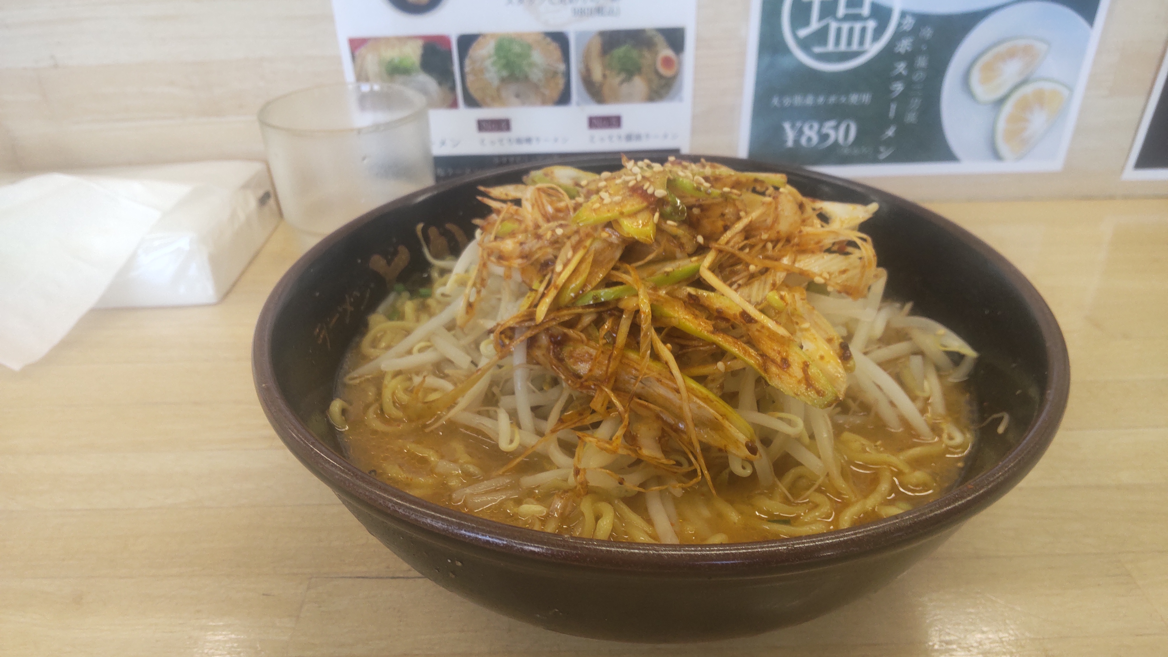 写真は店内レイアウト、ポスターとお店に行く前によった隣町のとん太ラーメンの味噌ネギ大盛りです。