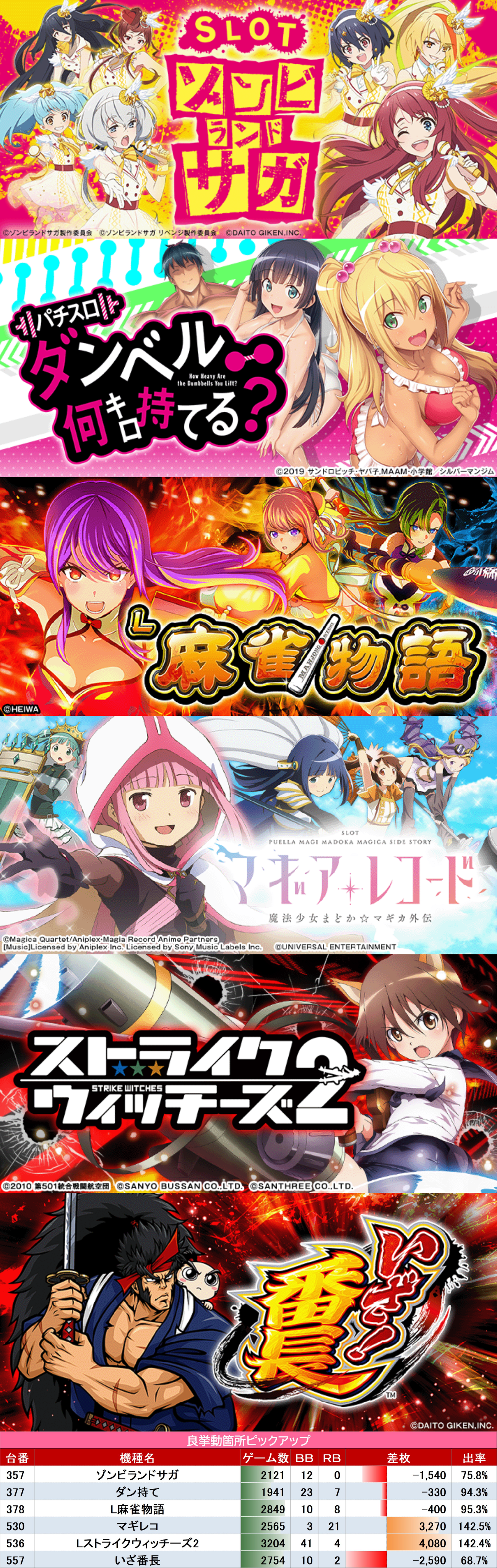 当日メインの仕掛けとなっていたのはLINE発表機種のバラエティ6台。打ち込み不足の影響もあり本領発揮といかなかった箇所も見受けられたものの「Lストライクウィッチーズ2」536番台からは4,000枚Over「マギレコ」530番台では3,000枚Overと優秀結果も確認できました。