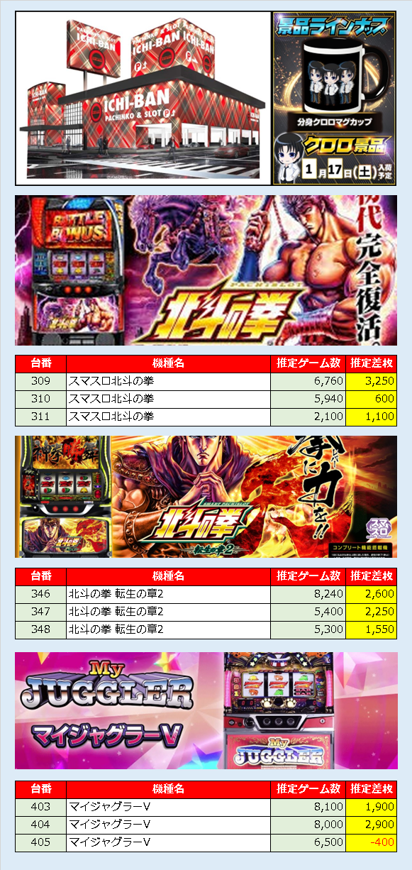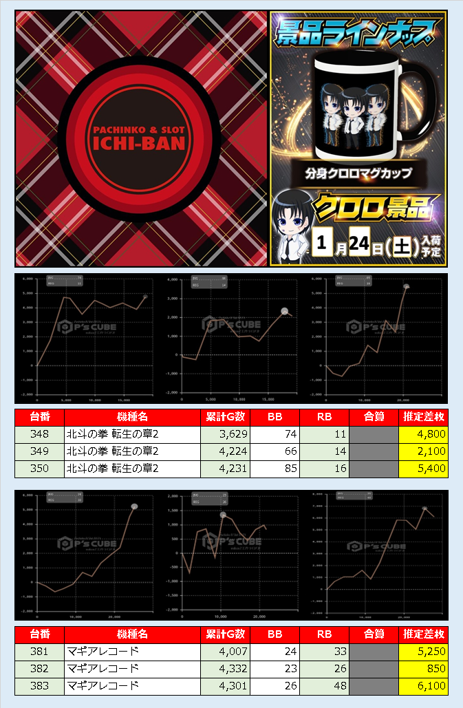 予想と期待通りの結果となりました。対象となる機種も竿、乃木坂46といった注目機種のほか、荒れやすい消防隊を対象としていたのも見事。鬼滅初開催としては十分ではなかったのでしょうか。その他北斗やカバネリも稼働状況は良好であり、納得の結果を叩き出していました。今後イベントのダブルクロスがある可能性は十分にあるので、稼働を予定されている方は積極的な稼働をお勧めします。