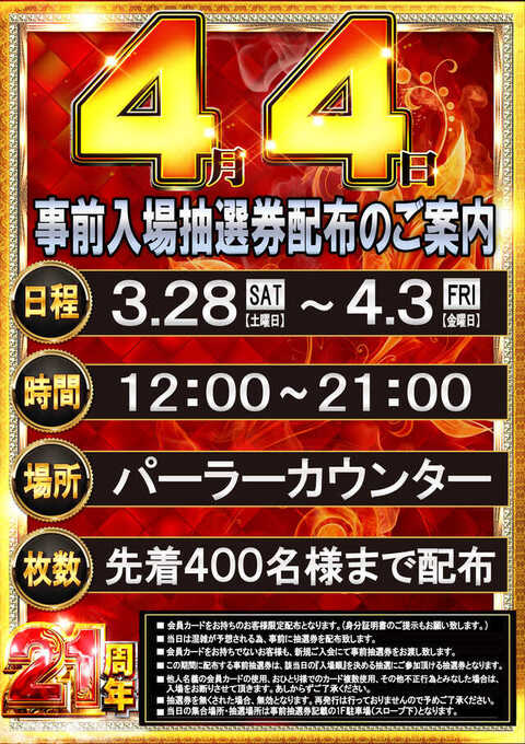 尚4月26日(土)に行われる、20周年クライマックスイベントの抽選券の事前配布は、昨日上限の350枚に達し配布を終了したとのことです。