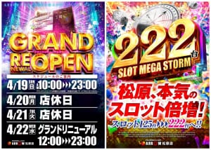 4/22のグランドオープンでパチスロを222台に大幅増台するようです。