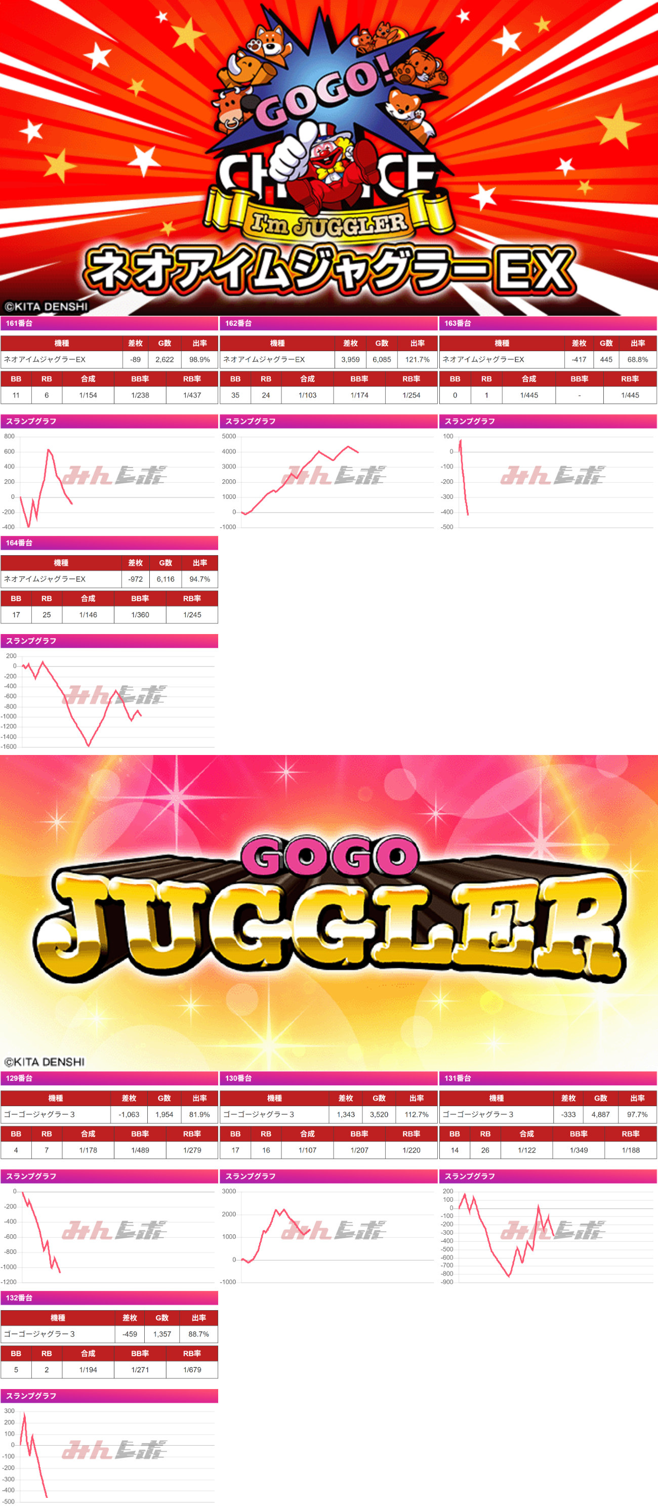 • 毎回5のつく日にわけのわからん煽りして、ジャグラーで客呼んで回収する日あっても4がジャグラー全台で1台くらいにです。てか、もう2時くらいには、通路化する有様笑