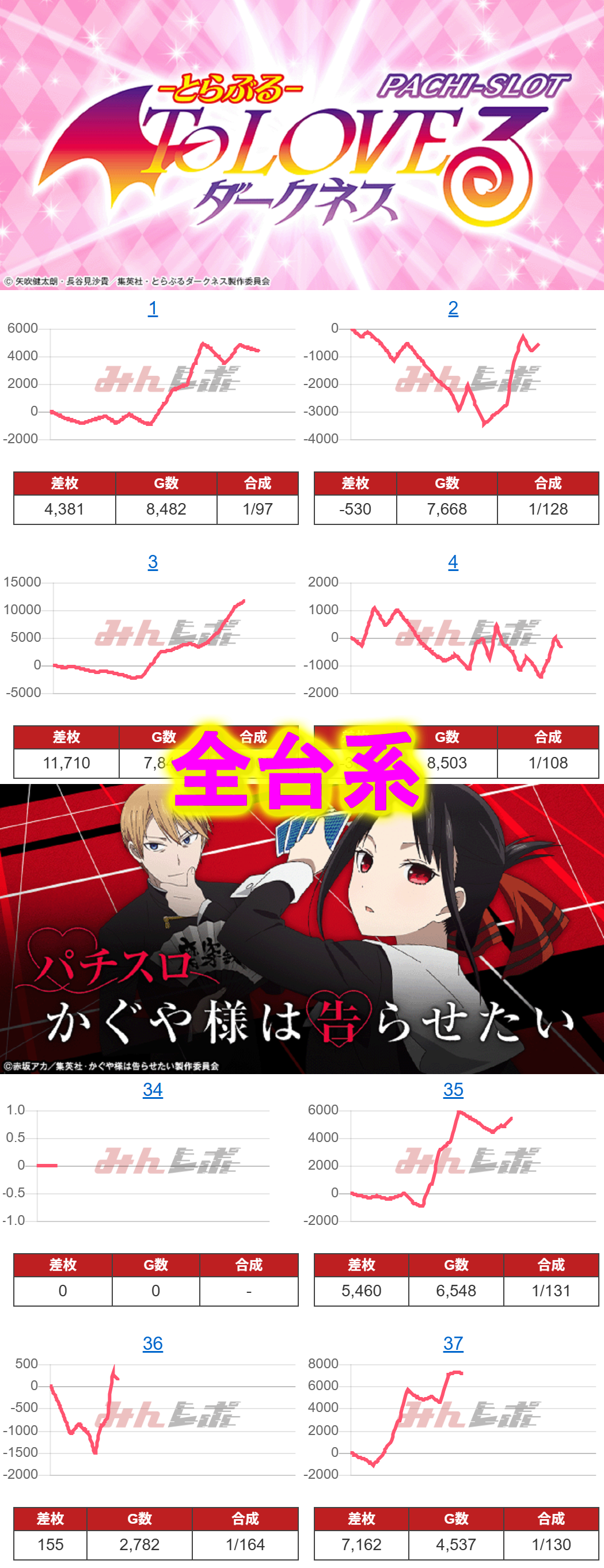 当日【全台系】の仕掛けと推測したのは「ToLOVEるダークネス」39番台からは差枚+12,708枚圧巻の出玉が炸裂!他2台は打ち込み不足もありやや不完全燃焼な印象ですが38番台は差枚+1,389枚、37番台もほぼプラマイゼロ付近で決着していますし打ち込みが伴えば更なる良結果に繋がった可能性はありそうかなと思います。