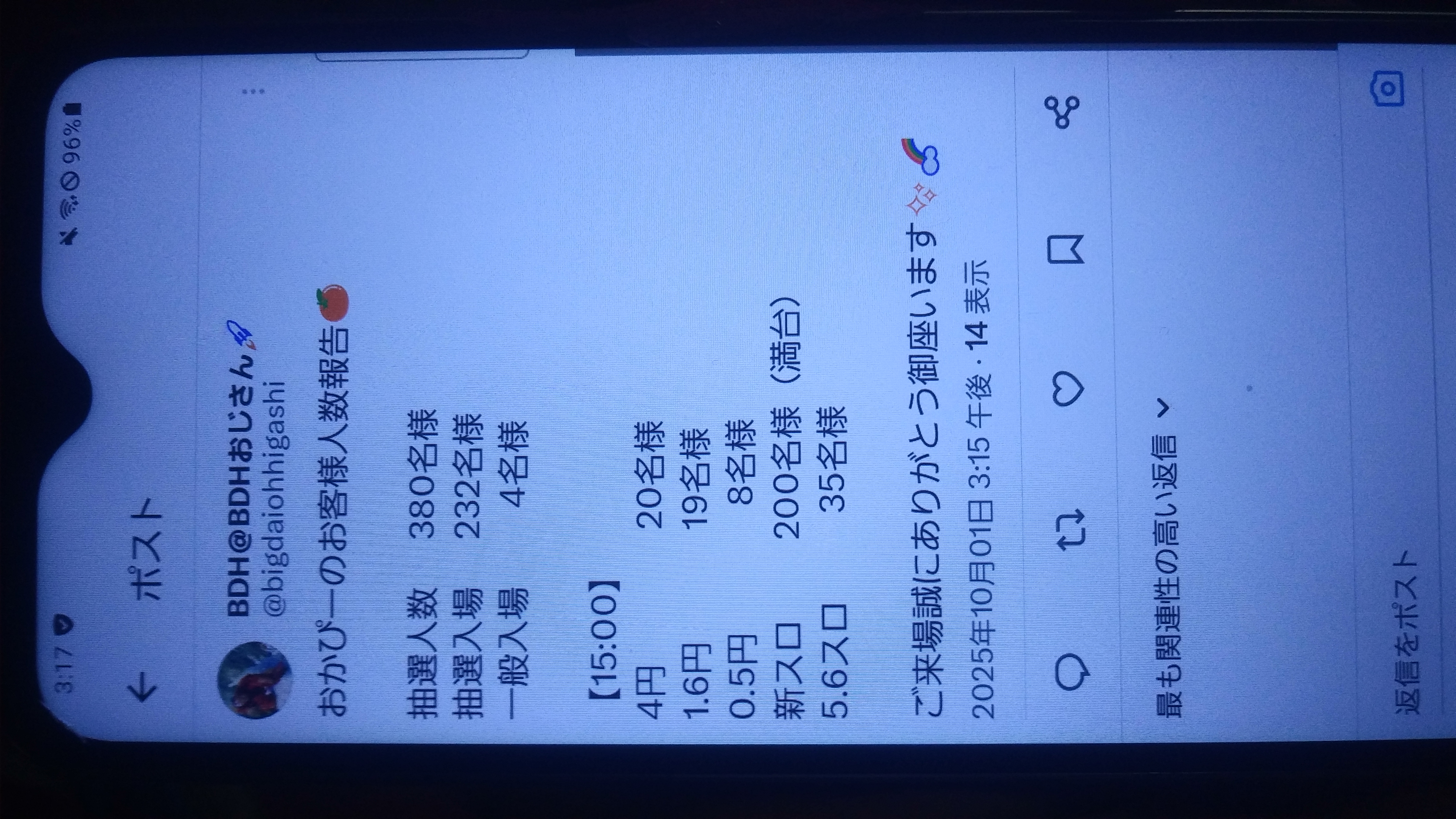 あれ!?今日は旧イベでしたよね~…しかも休日絡めの事情通の持ってる札幌限定情報では「アツイ!」と記されてましたが…1パチのフェスティバルなど扱いが酷く1Kで20回転と過去ワースト記録を更新(笑)(笑)12月来た時より更に釘締まっており残念でした。