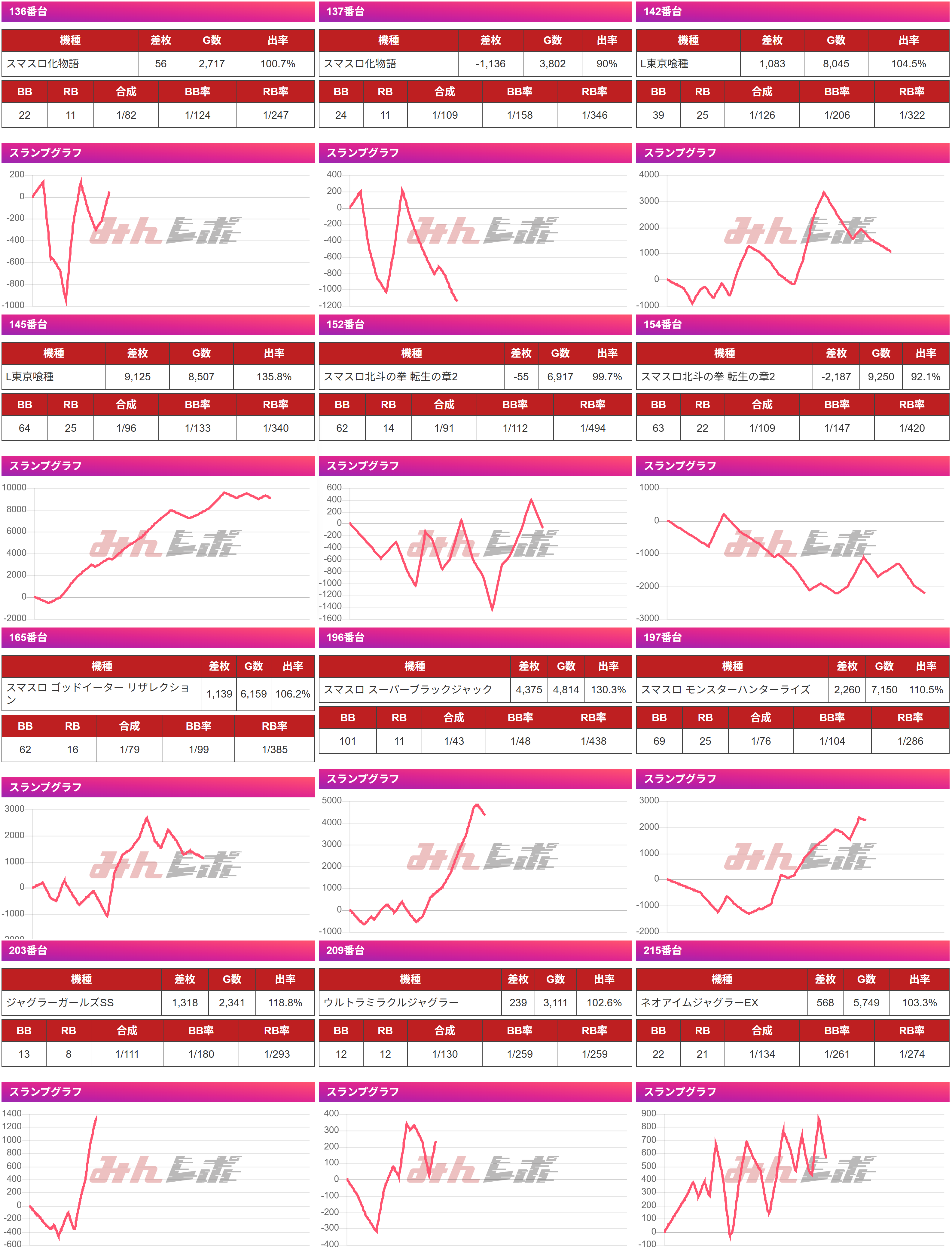 今回ピックアップした3機種は全て同一列の機種となっておりその対象箇所であったと推測。個々の出玉結果としては「東京喰種」は190番+14,722枚、189番+6,437枚、186番+4,271枚、188番+4,042枚と5台中4台が4,000枚Over!惜しくもマイナスだった1台もブン回されており確信を持てていたのは間違いないでしょう。