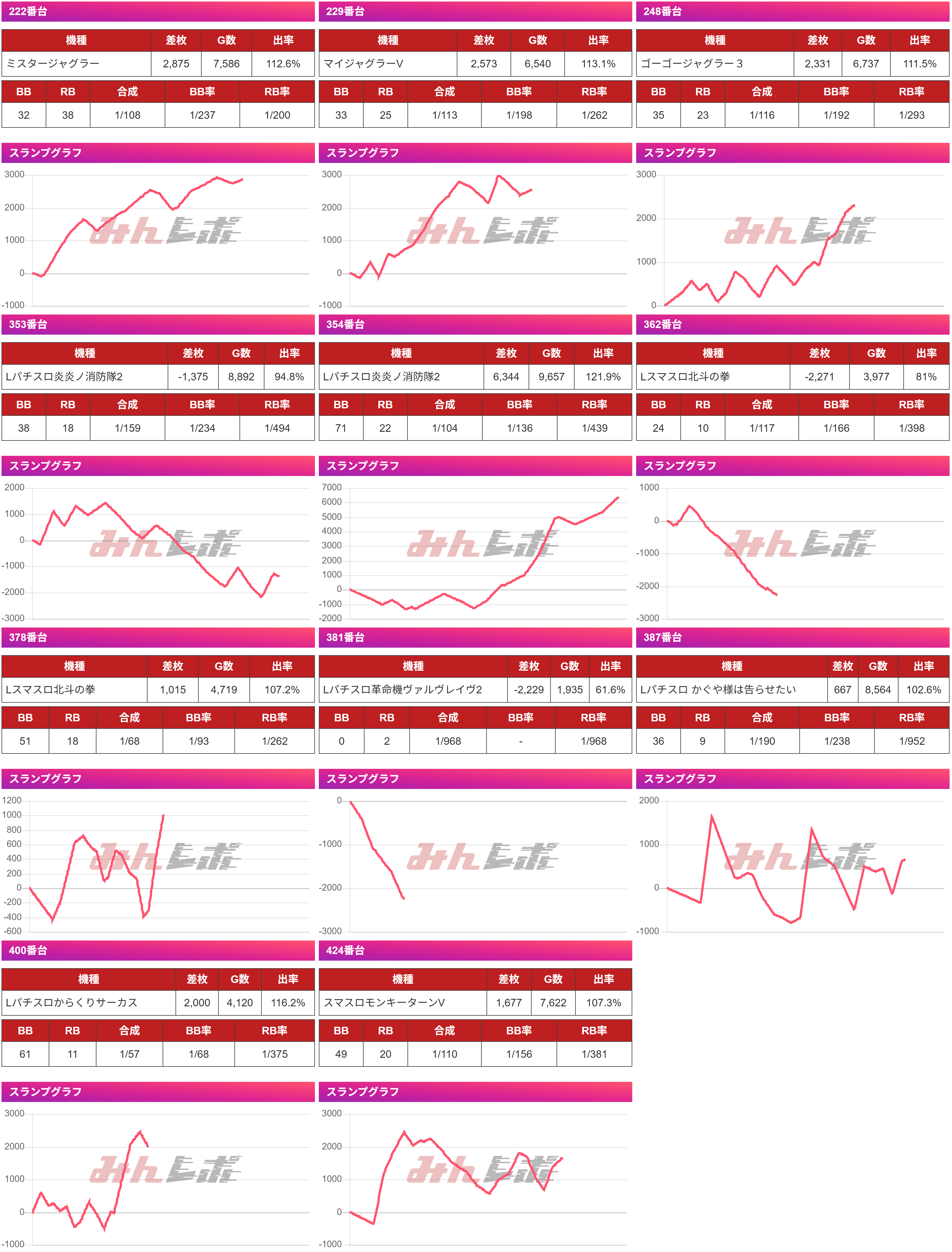 中でも「ネオアイム」が優秀で出玉面は214番台+2,972枚を筆頭に全台プラスの完全勝利を達成!REG確率も7台で1/278と優秀。その他にも「ジャグラーガールズ」205番台+3,000枚「マイジャグ5」241番台+2,125枚など2,000枚Overを記録した台が複数確認!ジャグ以外の機種にもブン回し台を確認できるなど幅広く楽しめる状況だったのではと思います。