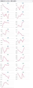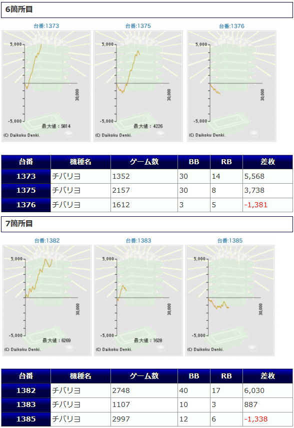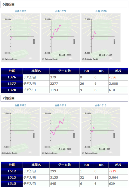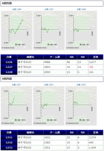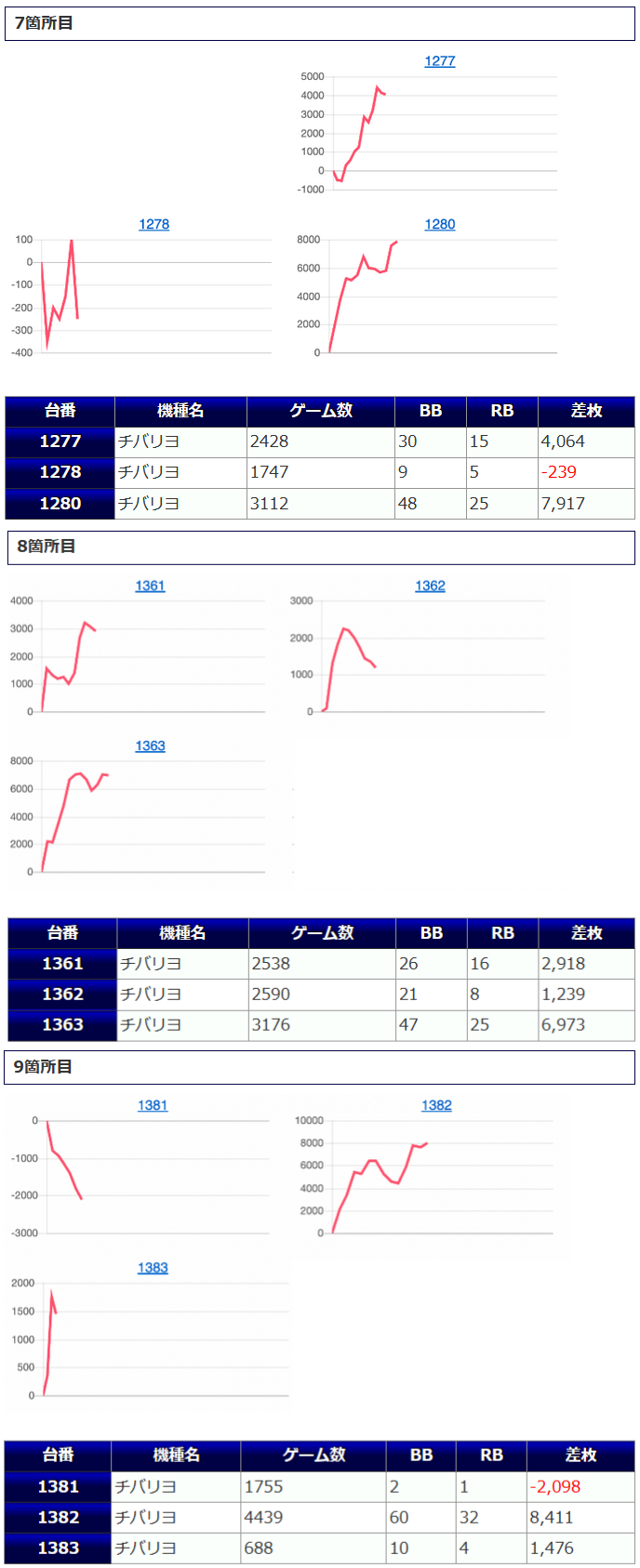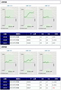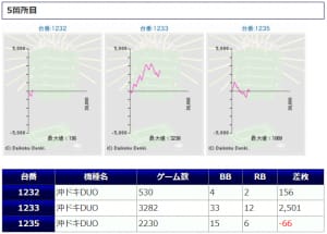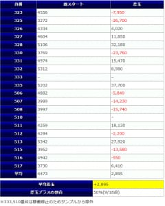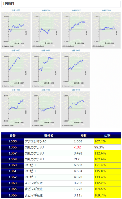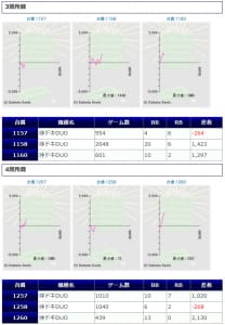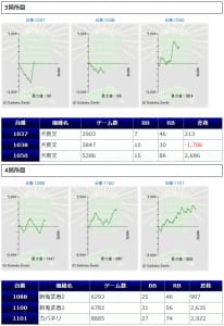 その他箇所を含めた全体のスランプグラフを見ると「キレイな右肩上がり」が多数見られ、差枚を多く獲得できた台はしっかりと伸ばし切って説得力のあるデータとなっており、高配分だった事が窺えるかと思います。残念ながら全台プラスとはいかず、展開が悪かった為に差枚マイナスとなった台は僅かに見受けられますが、結果数値から見ても仕掛けの信頼度は高いと言えるでしょう。