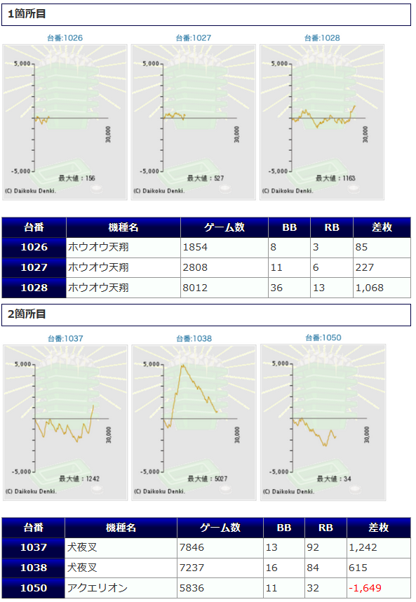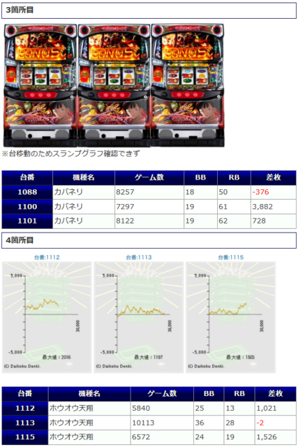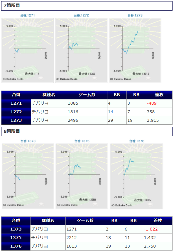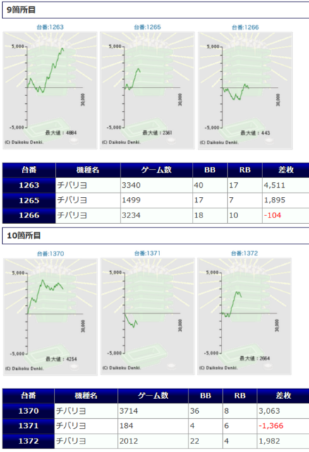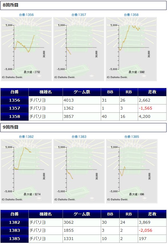 いつも通り、沖スロATが大きな差枚が見られ、「チバリヨ」からは+4,000枚に届く差枚が見られています。