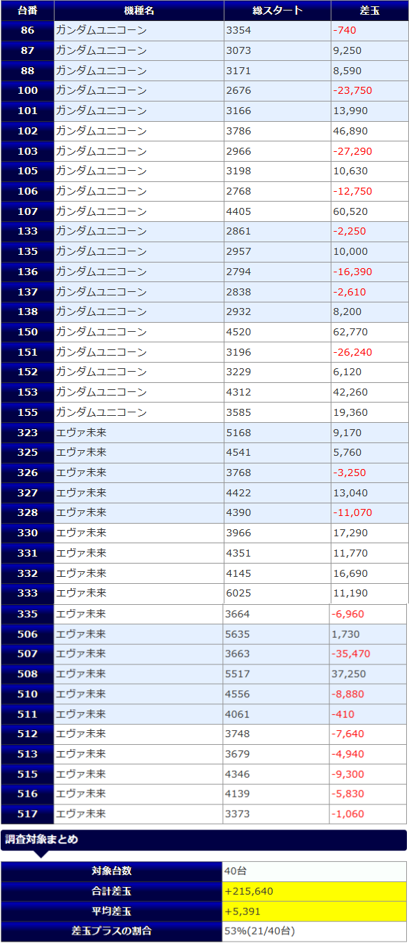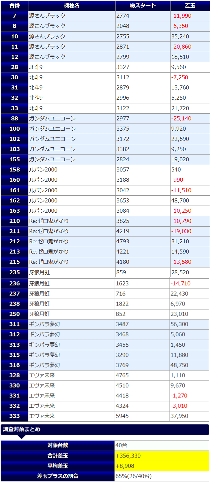 両機種から大きな差玉が見られましたが、機種トータルでプラスとなったのは「リゼロ鬼がかり」1機種となりました。