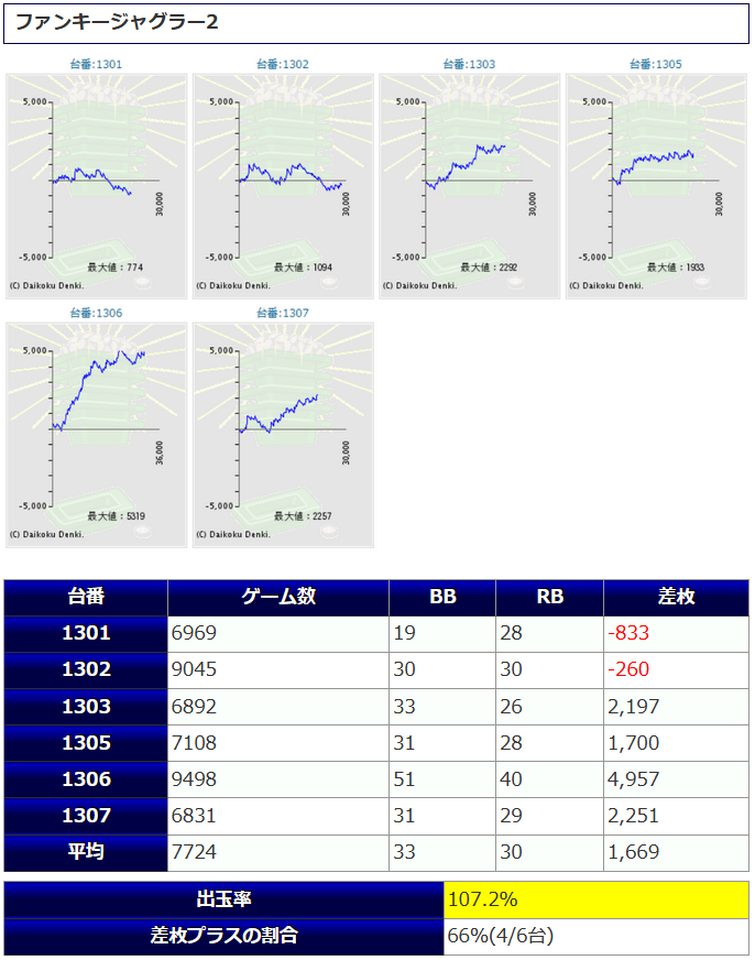 2箇所の仕掛けで、6台中、6台が全てプラス差枚の仕上がりで、5台が+2,000枚オーバーの差枚と非常に優秀な結果を残しています。