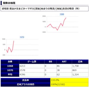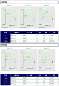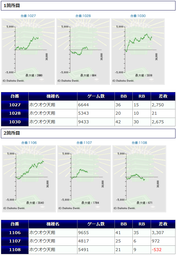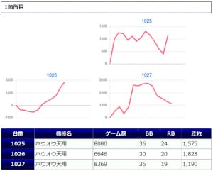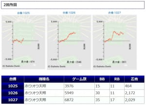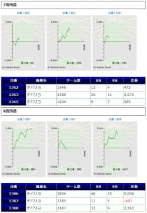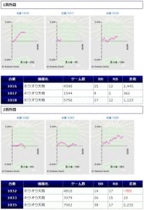 まず「鳳凰天翔」から+2,000枚前後が2台、+1,000枚前後が2台確認され、箇所としては②箇所目が+464枚、+2,172枚、+2,029枚の良好な結果を残しています。伸び悩みを見せた台が複数ありましたが「鳳凰天翔」は1台平均+628枚とまずまずな仕上がりになっていましたね。