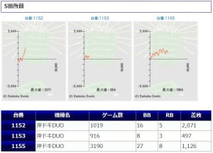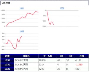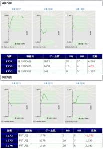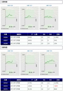 ノーマルタイプである「鳳凰天翔」「ジャグラー系」の仕掛けもありましたが、+1,500枚前後が2台と、若干伸び悩んでしまった印象ですね。しかし、マイナスとなった台は「鳳凰天翔」の1台のみと、しっかりユーザー側プラスに仕上がっていますので、安定感が感じられる結果になっています。