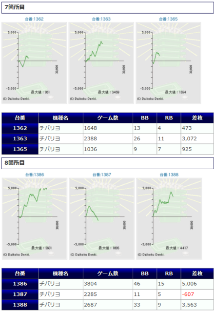 同店お馴染みの「チバリヨ」から+5,006枚、+3,563枚、+3,072枚「沖ドキDUO」+4,098枚、+2,645枚等、大きな差枚が炸裂して盛り上がりを魅せていたようです。