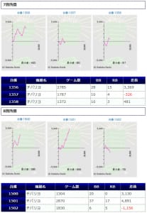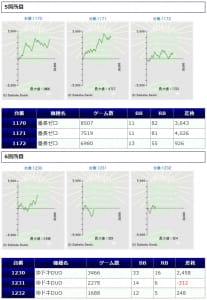 「ガンダムUC」は、+3万発オーバーが1台、+1万発オーバーが3台見られましたが、残念ながらマイナス差玉の方が目立つような結果になってしまい、ユーザー側マイナスで着地しています。