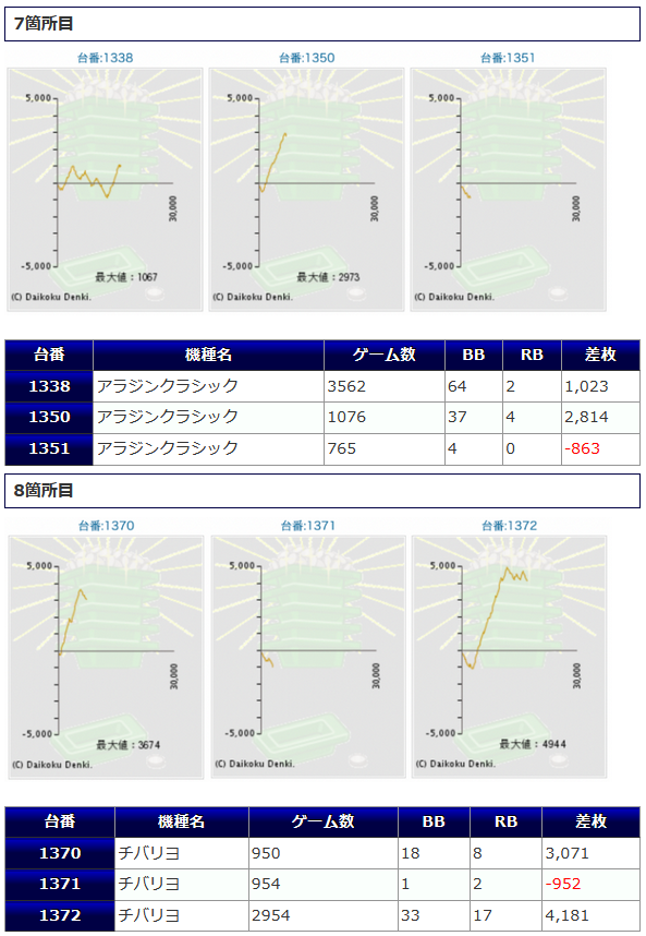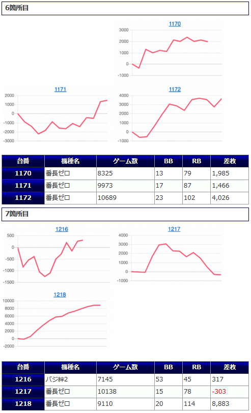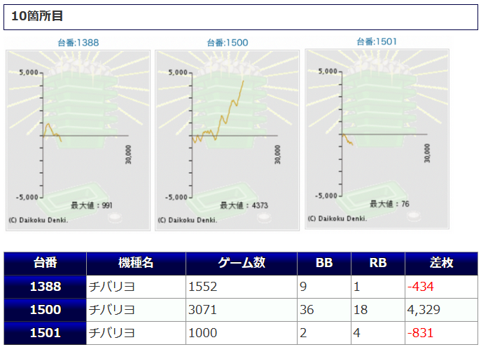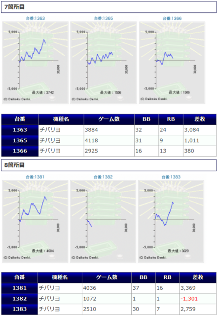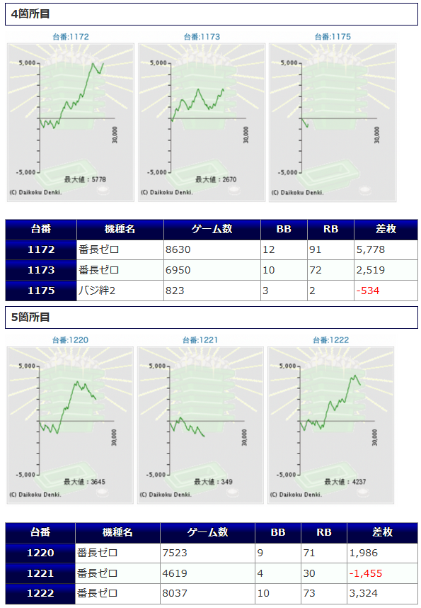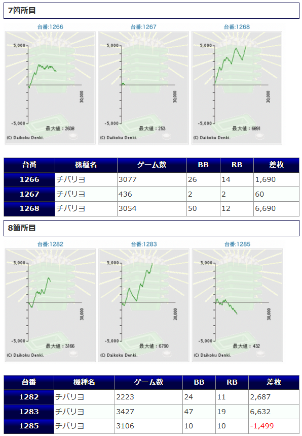 目立った差枚としては、チバリヨ+6,690枚、+6,632枚、番長ZERO+5,778枚、沖ドキDUO+4,012枚が挙げられ、チバリヨ中心に盛り上がっていた印象ですね。