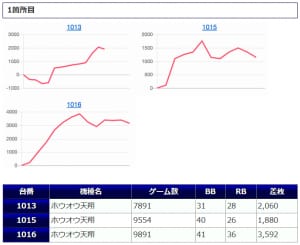最終的には【平均差枚+1,306枚、平均出率109.0%、差枚プラスの割合79%(26/33台)】と良好な結果となりました。