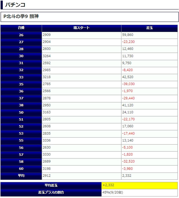 北斗の拳9からは平均 +2,332発を平均G数2912Gから。