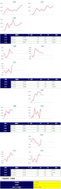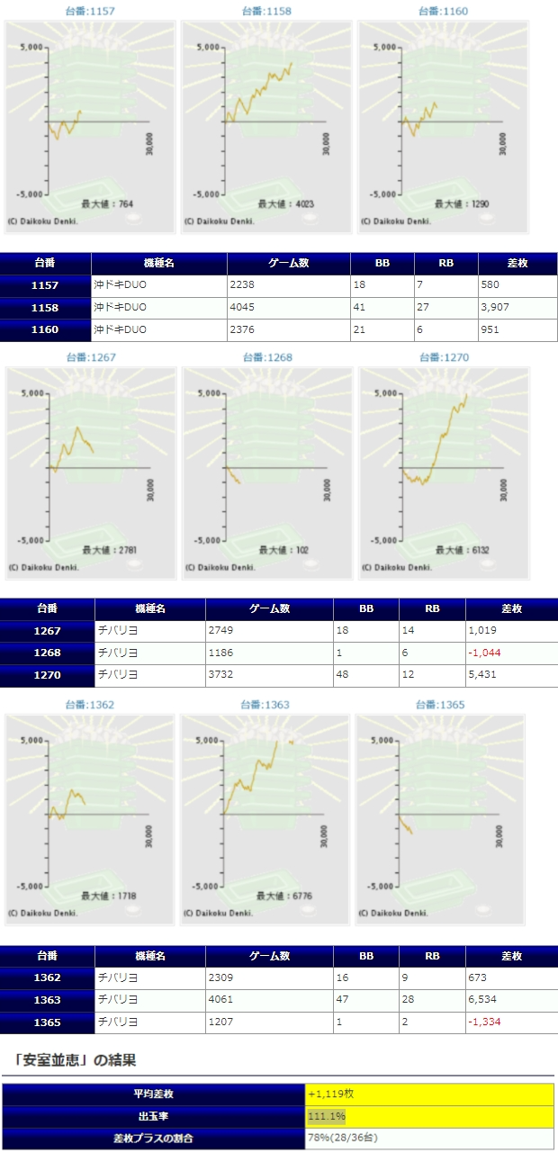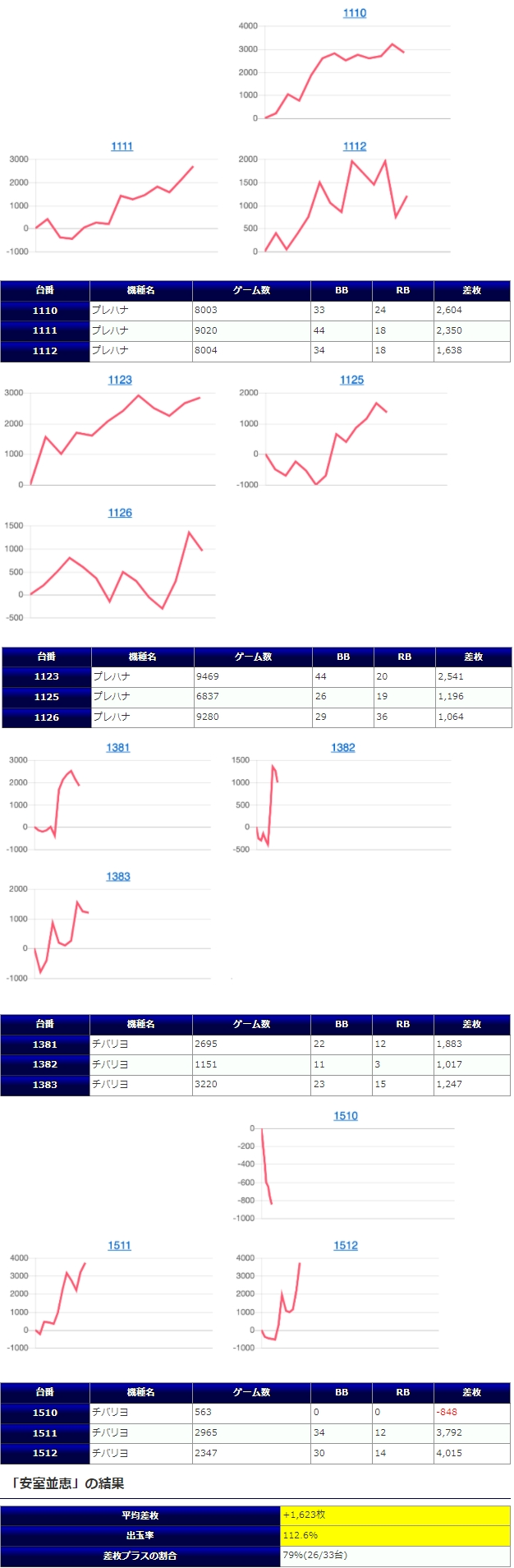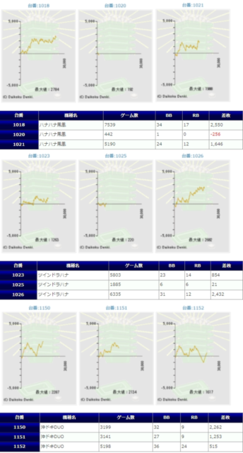 8箇所、平均+1,395枚、出率113.4%というのは仕掛けの構成の平均出率で設定⑥の平均値を超えるものとなっているのはこれまでと同様ですが、今回もハナハナ系で強い結果を魅せる事は出来なかったもののプラス着地出来ている台も多く、全体勝率でも79%はまずまず優秀な結果。