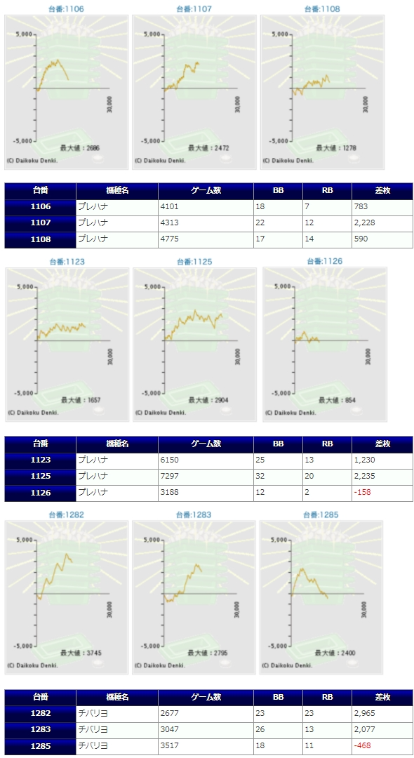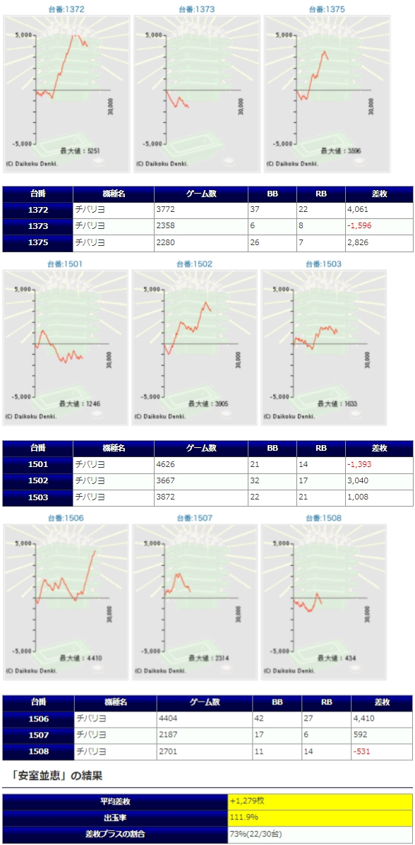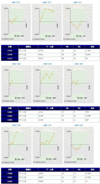 ハナハナも強い差枚を付けてはいますが、チバリヨ以上に結果がバラ付きこちらは安定感を期待したいAタイプだけにチバリヨより稼働が伸びない、埋もれた台が目立つのは残念なポイント。