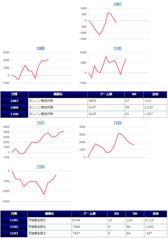 最新台のモンハン黄金狩猟、牙狼黄金と、6号機での仕掛けは良いと思いますし、結果もそれぞれモンハンで+2,230&+1,427、牙狼黄金で+4,119&+1,642と結果も見せられました。