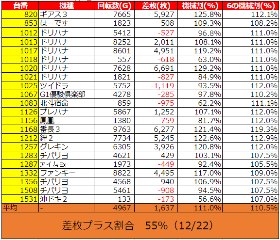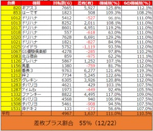 差枚プラスの割合55%(12/22台)