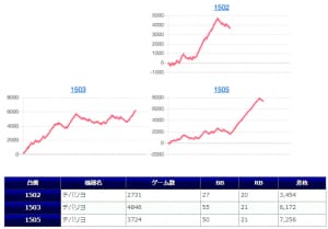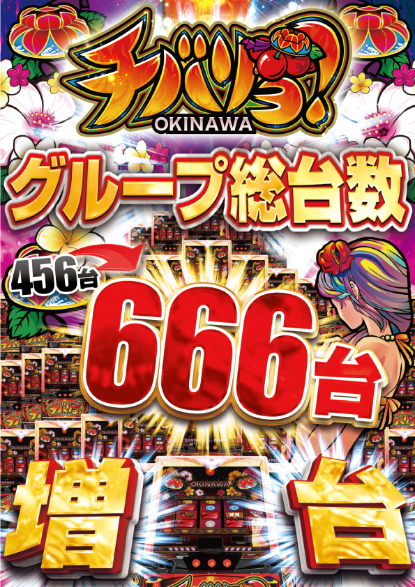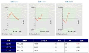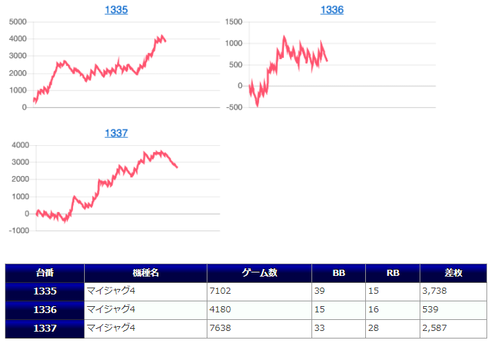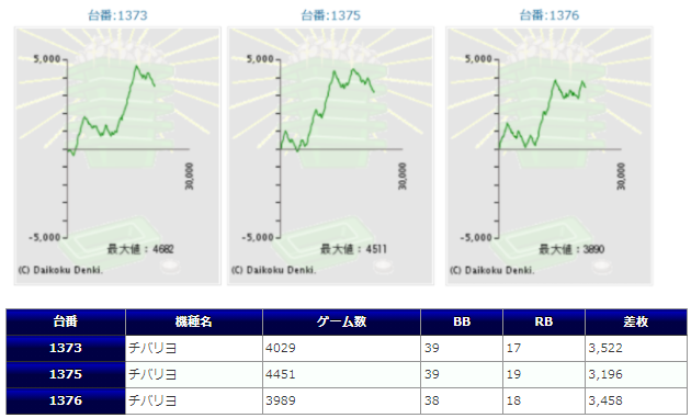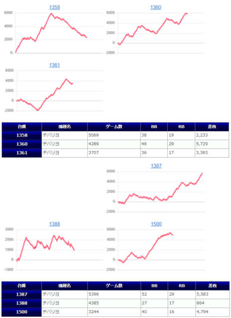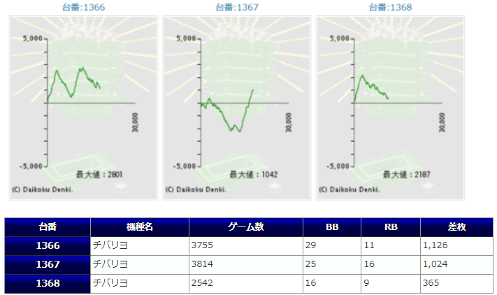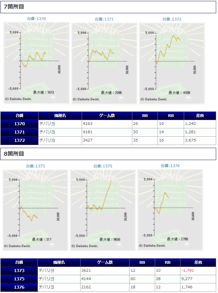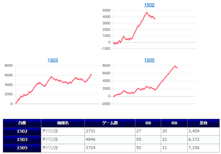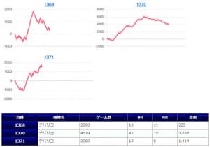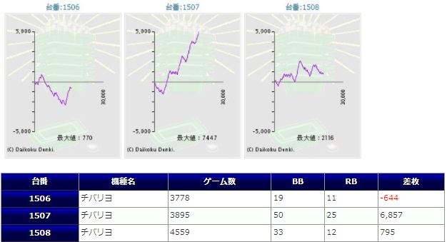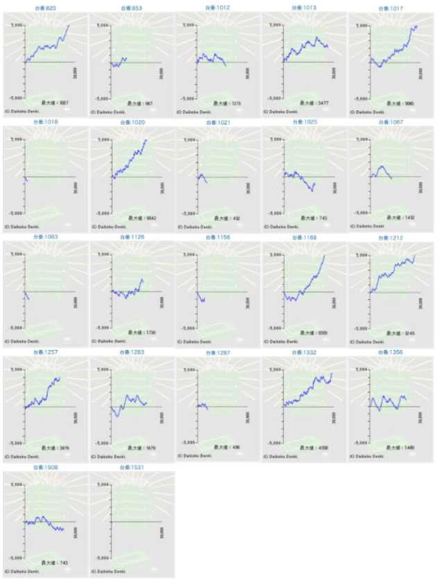 チバリヨが5箇所15台のボリュームで、1267番台からの+5,939枚を筆頭に+5,729枚&+5,583枚と同機種らしいメリハリの効いた出方をしており、また15台中13台がプラスだった点からもかなりハイレベルな仕掛けだったのではないでしょうか。