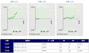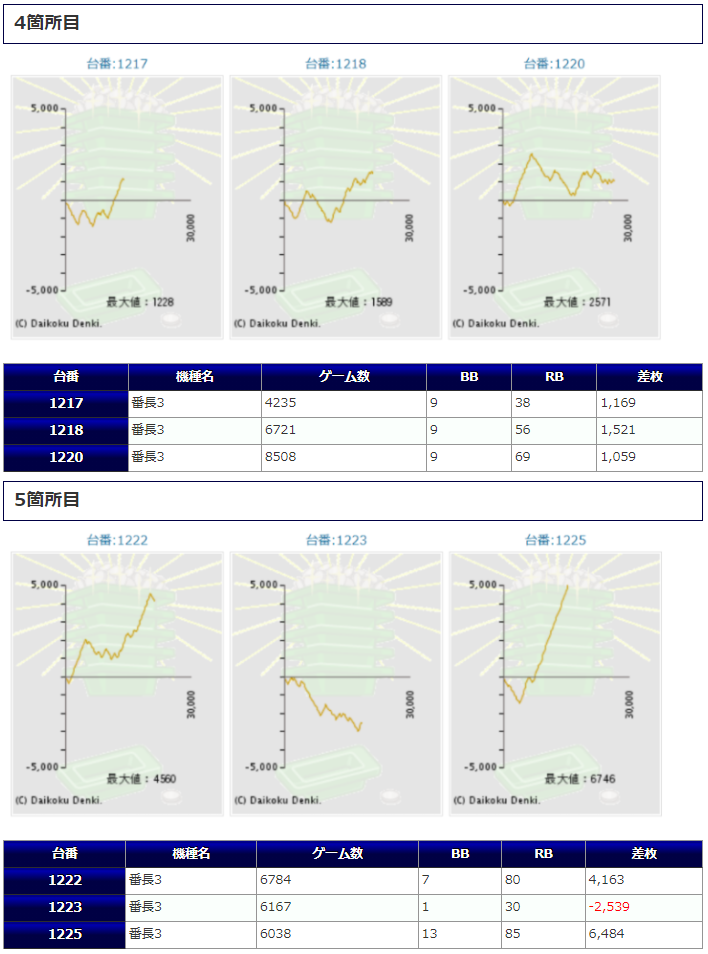 またそれ以外でもしっかり出ていた機種としては、番長3で1225番台からは+6,484枚、1222番台から+4,163枚、まどマギ2でも+2,674枚と人気のART機でしっかり出ていた点は多くのユーザーにとっても嬉しい結果になったのではないでしょうか。