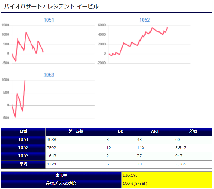 両機種共にそこそこ回されており、計7台全てがしっかりプラスだったことからも間違いなく優秀な仕掛けだったように思います。「バイオ7」が一部早めに見切られていた点は少し気になりますが、それ以外は特に問題なく出し切れていますし、この6号機のラインナップが全てプラスだった点からも安心して打てたユーザーも多かったのではないでしょうか。