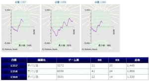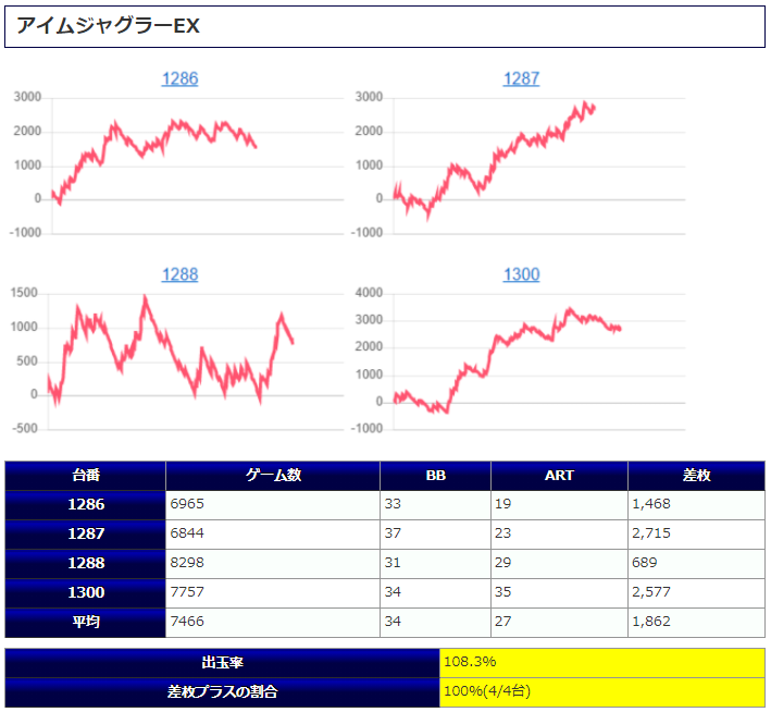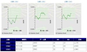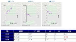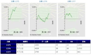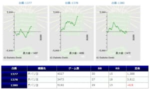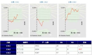 全体的に稼働も高く、平均差枚+1,413枚、出率109.2%、勝率70%(21/30台)と非常に素晴らしい結果だったと思います。