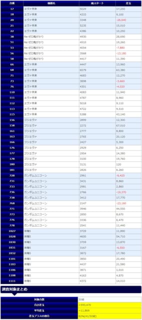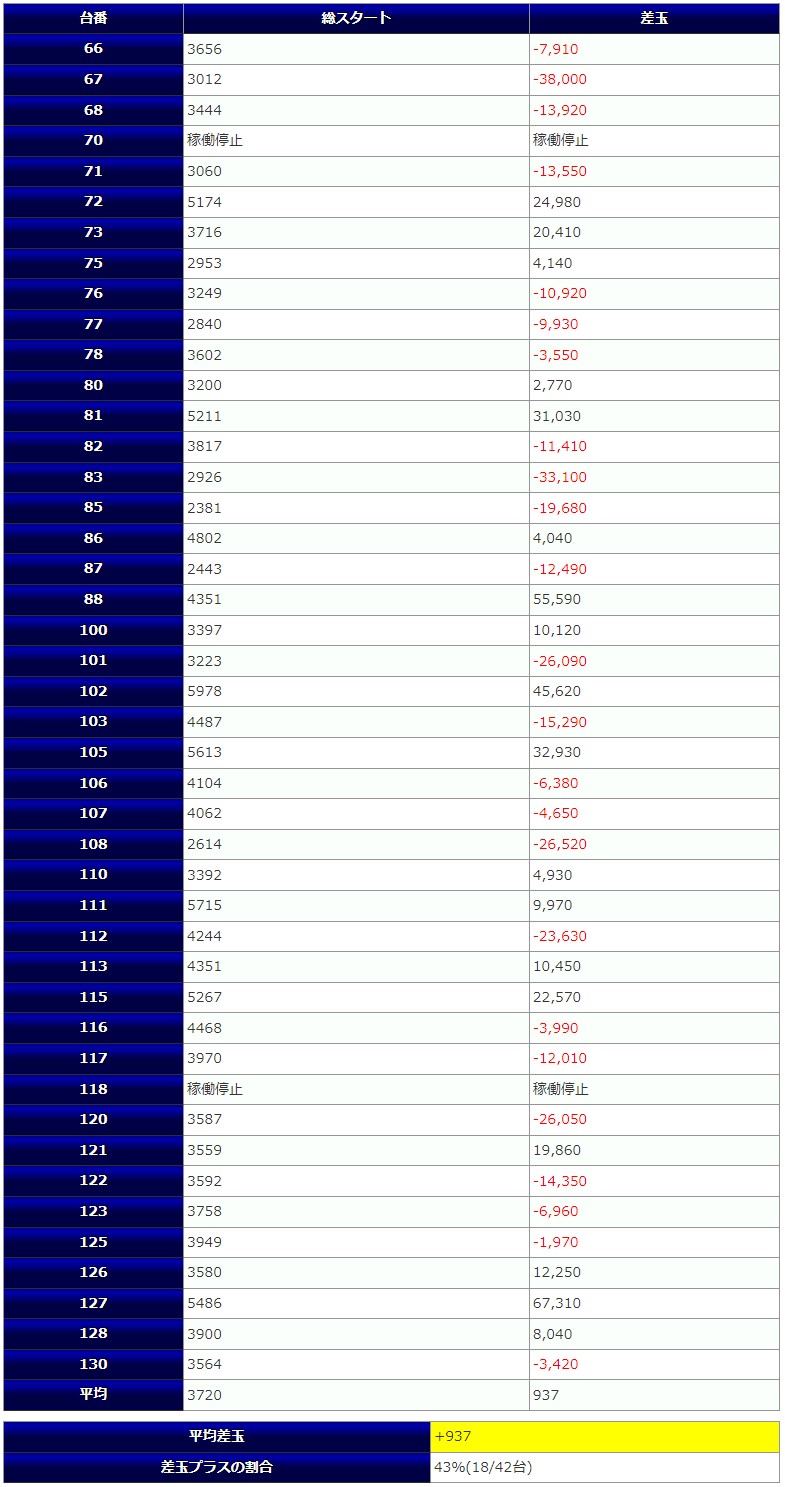 全体の結果としては【平均差玉 +937発、差玉プラスの割合 43%(18/42台)】となりました。