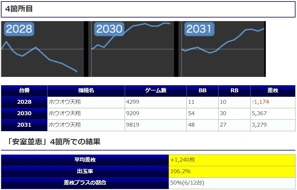 「ハナハナ鳳凰天翔」は2台が9000Gを超える稼働で +5,367枚、+3,279枚と大きい差枚を叩き出しており、ボーナス合成確率を見ても、⑥を上回る数値でしたので、ユーザーは十分な手応えを感じていたことでしょう。