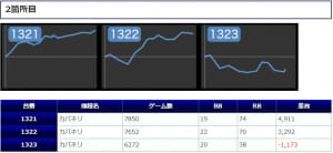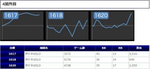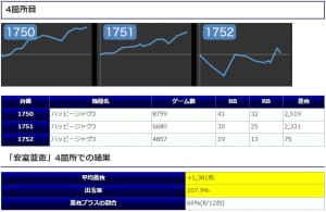 「アイジャグ」は2台がマイナス差枚となってしまい、内容を見てもREG確率が弱かったので、フル稼働の粘りとはならなかったようです。