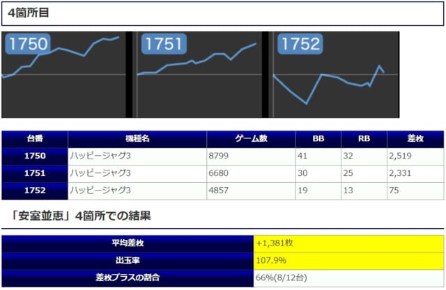 全体の結果としては【平均差枚 +1,381枚、出玉率 107.9%、差枚プラスの割合 66%(8/12台)】となりました。
