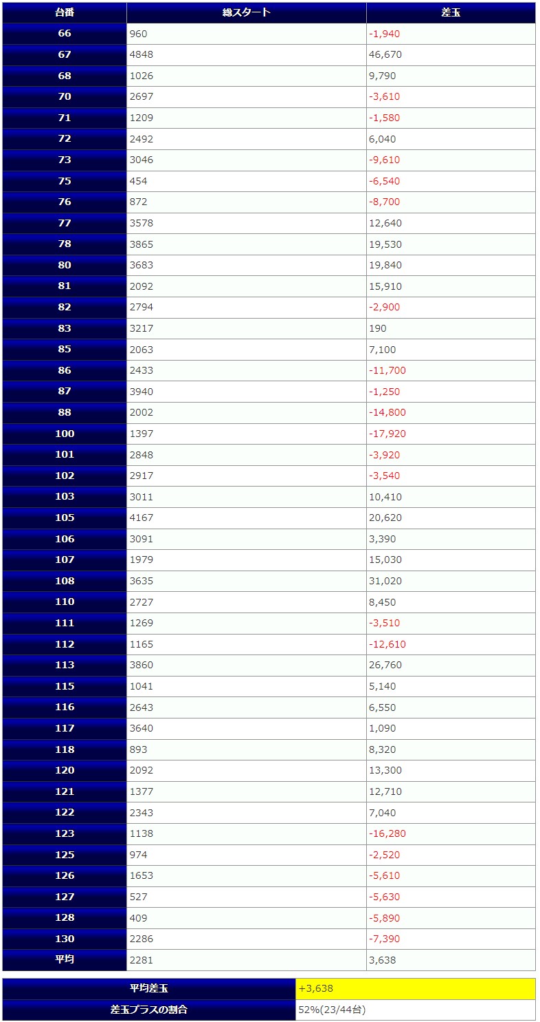 全体の結果としては【平均差玉 +3,638発、差玉プラスの割合 52%(23/44台)】となりました。