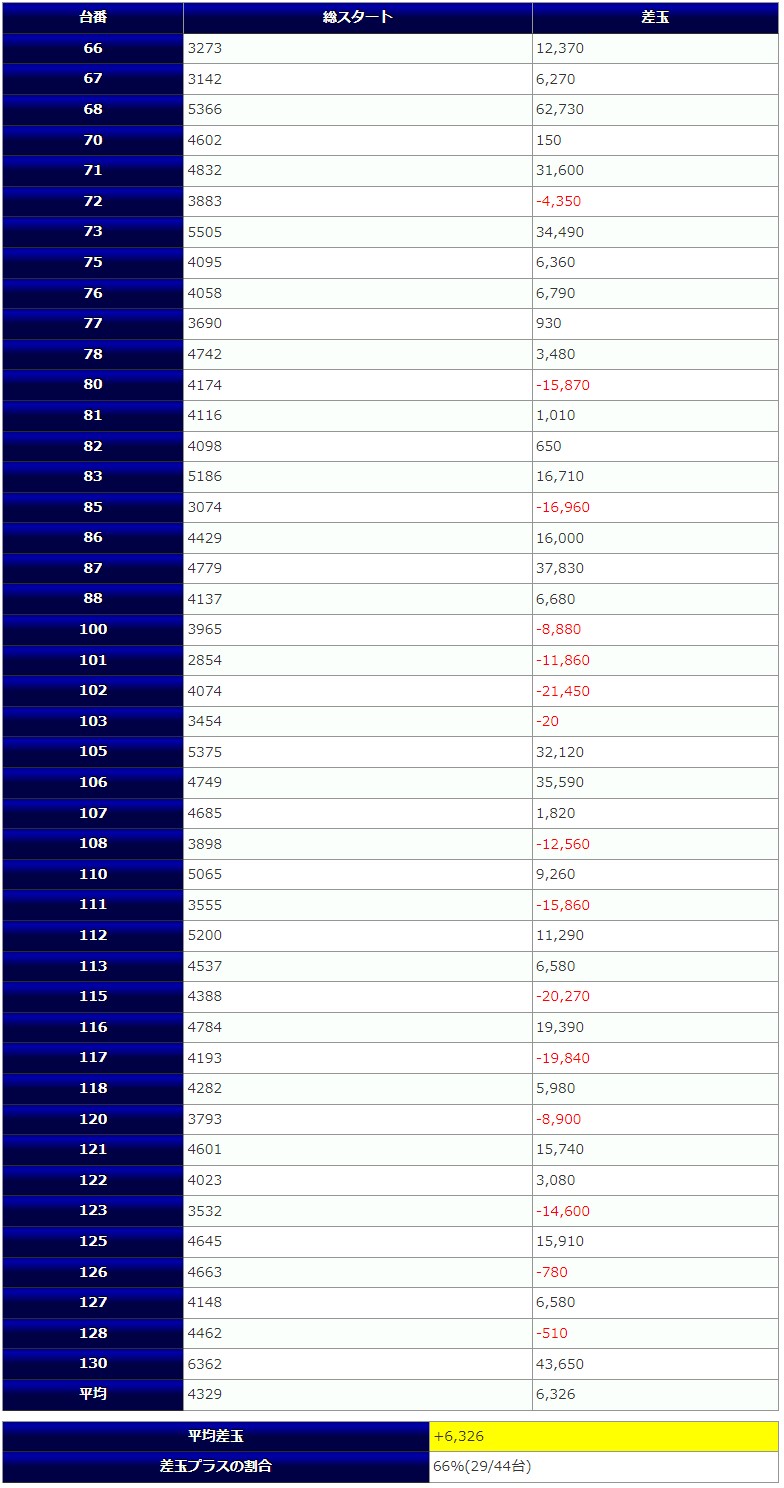 大きな差玉としては、+62,730発を筆頭に +43,650発、+37,830発、+35,590発などが見られ、44台中、29台がプラス着地に成功しています。