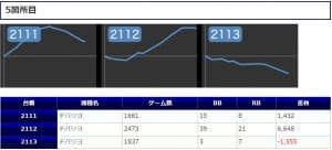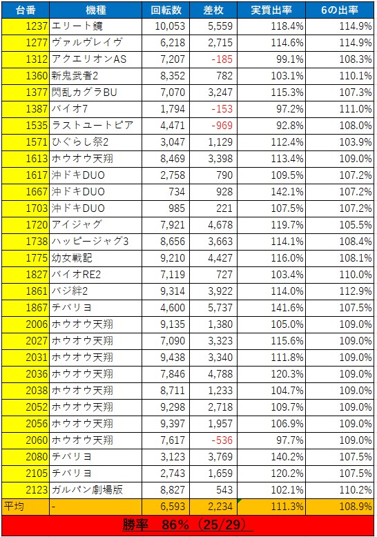 スロットは対象29台の平均ゲーム数が6593Gと回された上で、出玉率111.3%と⑥の想定出率を上回っており、勝率86%と優秀な営業であったと言えると思います