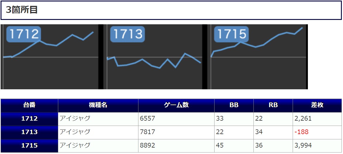 スロットは半数以上をスマスロで用意したことは評価したいと思いますが、3台並びが全台マイナスという完敗している箇所が3箇所もあったのはマイナスの評価材料となります。