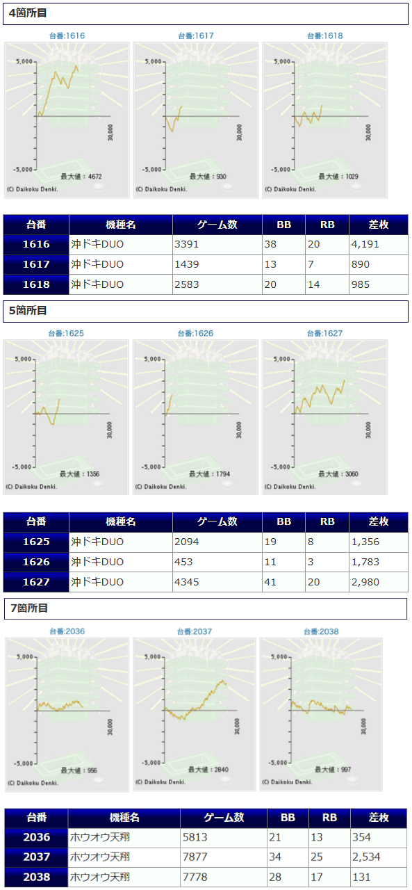 続いて、沖スロコーナーですが、展開が荒い「沖ドキDUO」メインでの仕掛けであったにも拘らず、全てがプラス差枚での着地に成功と、良い意味でらしくない結果が見られています。