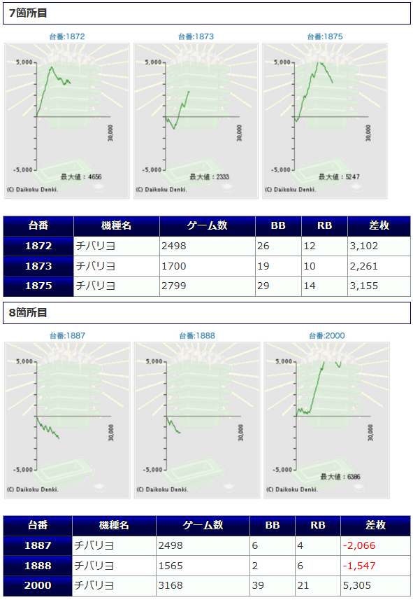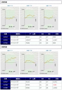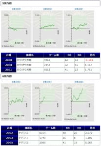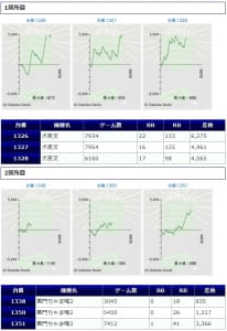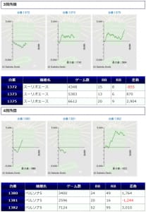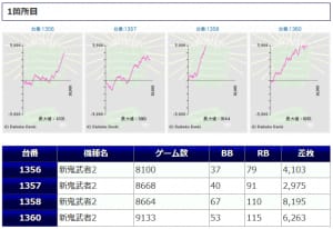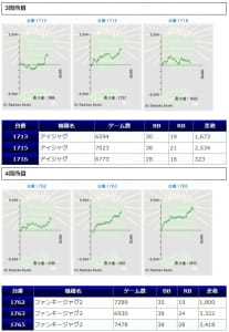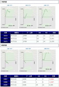 その他箇所を含めた全体のスランプグラフを見ると「キレイな右肩上がり」が多数見られ、差枚を多く獲得できた台はしっかりと伸ばし切って説得力のあるデータとなっており、高配分だった事が窺えるかと思います。残念ながら全台プラスとはいかず、展開が悪かった為に差枚マイナスとなった台は僅かに見受けられますが、結果数値から見ても仕掛けの信頼度は高いと言えるでしょう。