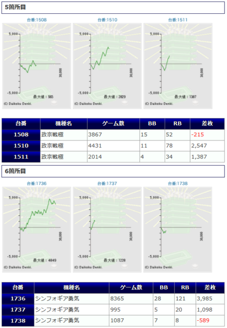 続くように「黄門ちゃま喝2」から+3,366枚「ペルソナ5」から+3,010枚、「リオエース」+2,904枚「政宗戦極」+2,547枚と、それぞれの機種から見ごたえがある結果が見られる等、当日は6.5号機が盛り上がりを見せていたようです。