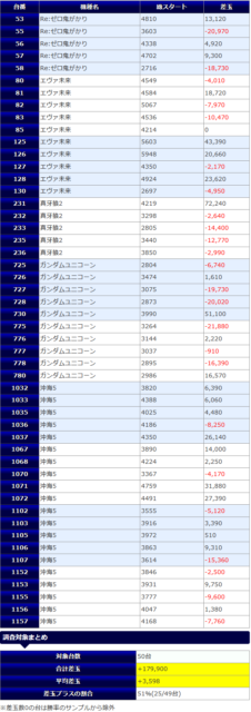 全台しっかりと打ち込まれており「エヴァ未来」+62,060発を筆頭に「リゼロ鬼がかり」+39,250発「ガンダムUC」+47,170発「ジャギの逆襲」+36,920発「沖海5」+32,520発等、大きな差玉が多数確認される優秀な結果となっています。
