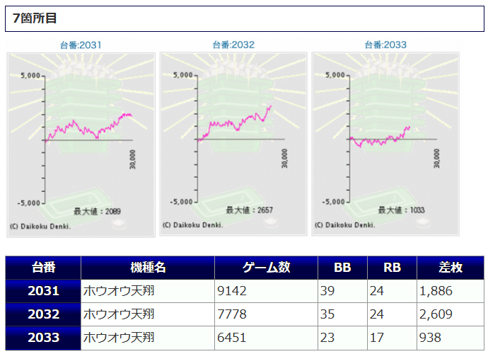 粘りの打ち込みが見られていたのはノーマルタイプである「鳳凰天翔」で、2037番台は約8,000G稼働で+2,534枚の獲得と、中身にある程度の信頼が保てるような結果を残しています。