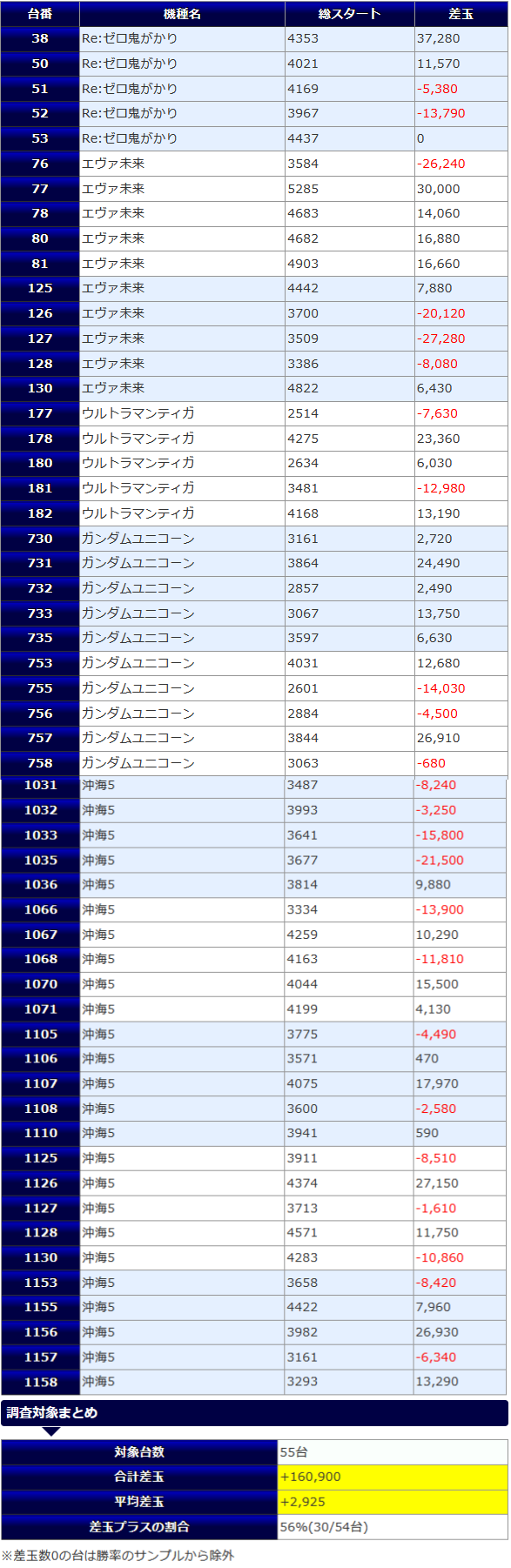 全台しっかりと打ち込まれており「リゼロ鬼がかり」+37,280発を筆頭に「エヴァ未来」+30,000発「ウルトラマンティガ」+23,360発「ガンダムUC」+26,910発「沖海5」+27,150発等、大きな出玉が多数見られる優秀な結果になっていましたね。