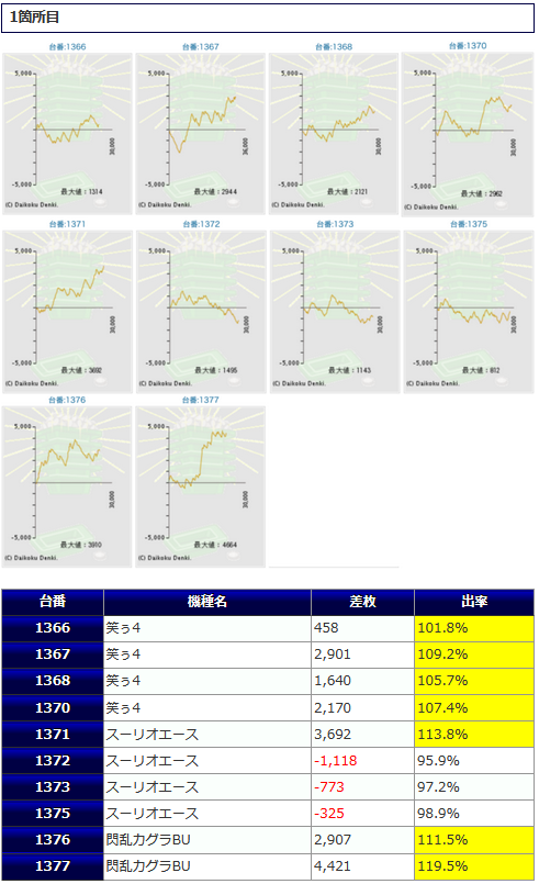 ①箇所目の6.5号機箇所もしっかり活躍が見られており、中でも「笑ゥ4」は全台プラス差枚が達成され、状況の良さが感じられるような結果になっています。