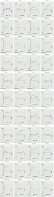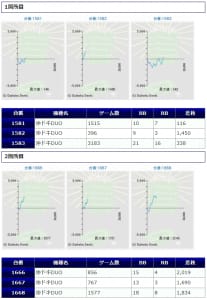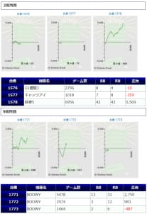 全体のスランプグラフを見ると「キレイな右肩上がり」が多数見られ、差枚を多く獲得できた台はしっかりと伸ばし切って説得力のあるデータとなっており、高配分だった事が窺えるかと思います。残念ながら全台プラスとはいかず、展開が悪かった為に差枚マイナスとなった台は見受けられますが、結果数値から見ても仕掛けの信頼度は高いと言えるでしょう。