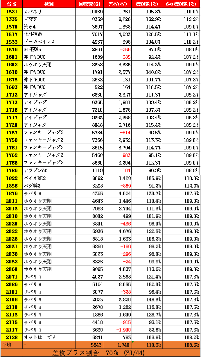 また、1106番台~1111番台「沖海5」は、5台並びで全てがプラス差玉になっており、状況の良さが伝わってくるような結果になっています。